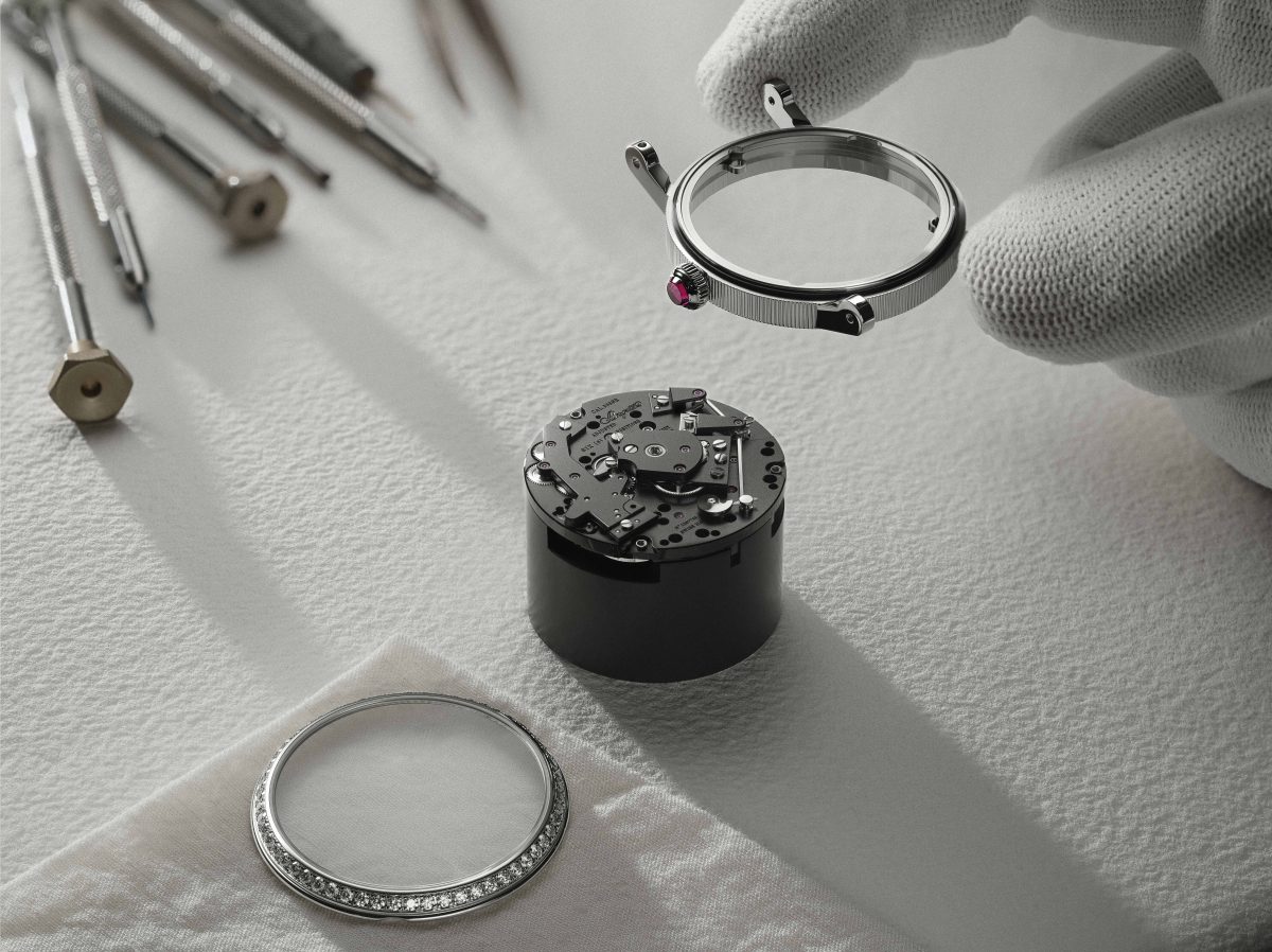 ベゼルには58石、バックルには25石のブリリアントカットダイヤモンドをセッティングし、さらにリューズのルビーがワンポイントとして輝く。37mm径の控えめなホワイトゴールドケースによって、ドレスウオッチとしての気品と機械式時計としての魅力を見事なまでシンクロさせている。
