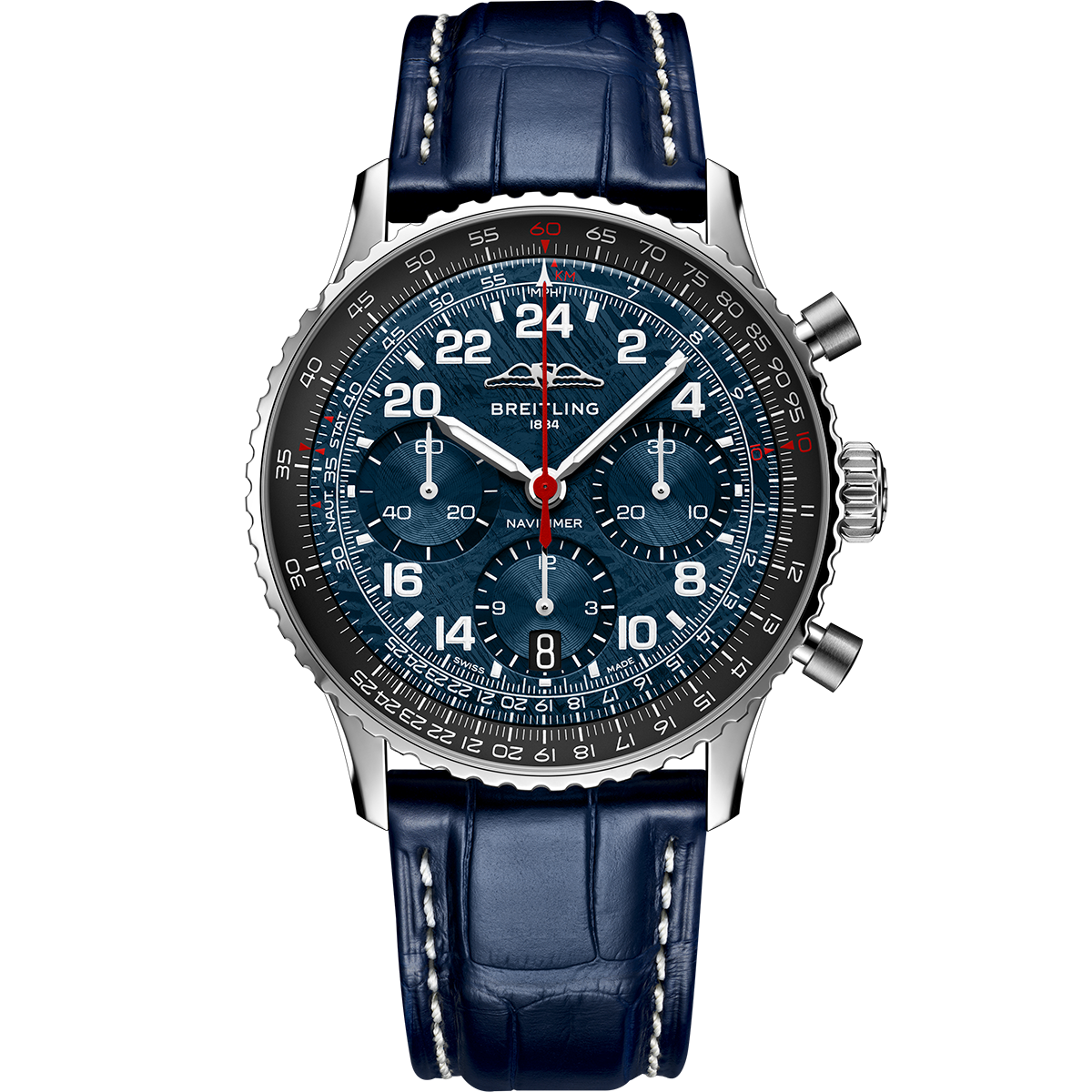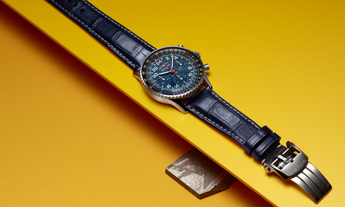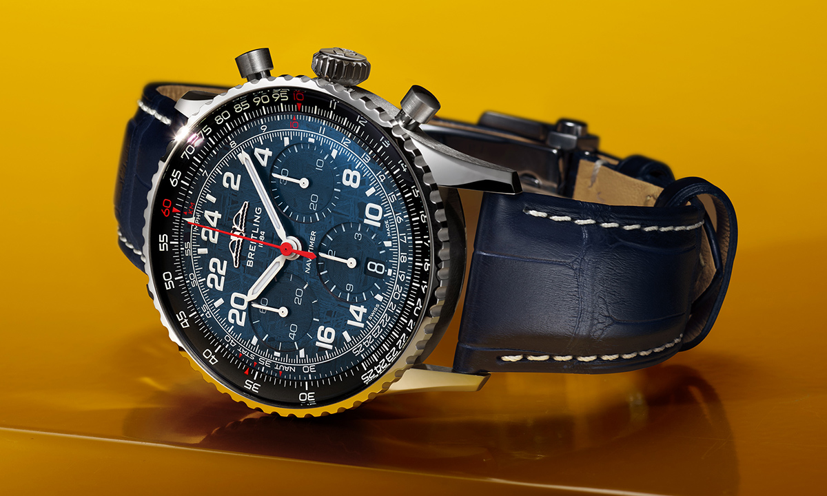 ブライトリングが宇宙空間で使用可能なクロノグラフとして開発した、24時間表示の腕時計「ナビタイマー コスモノート」から、新作が登場した。文字盤にメテオライト(=隕石)を用いた特別な「ギャラクシーブルー」文字盤は、アメリカで先行発売されたのち、5月ごろから順次日本でも展開される予定。世界限定450本、価格は166万1000円となる。