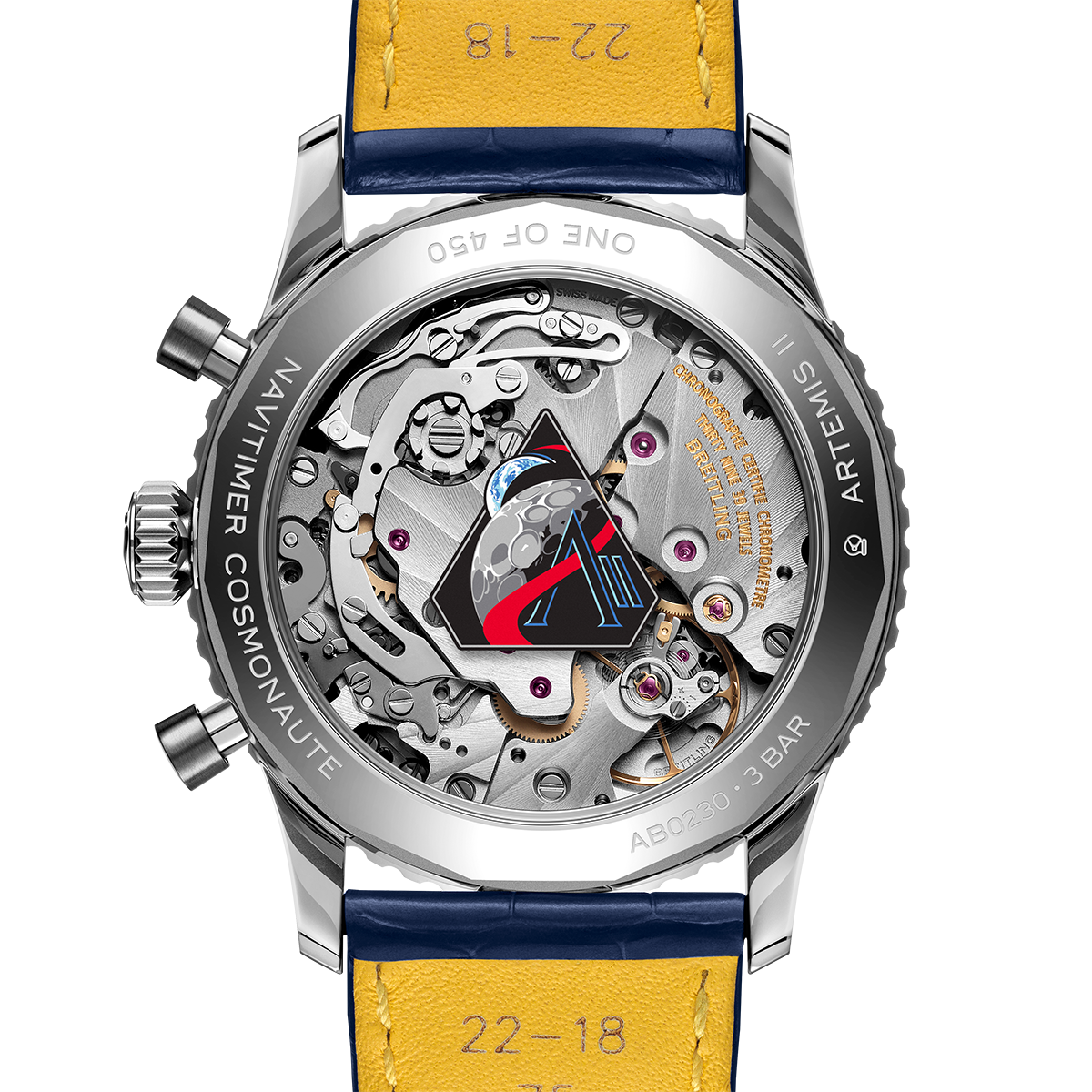 搭載するのは、マニュファクチュールキャリバーB02。コスモノートのために開発された24時間表示の手巻きクロノグラフで、垂直クラッチ式のメカニズムを伝統的なコラムホイール方式によって制御する。もちろんブライトリングは100%クロノメーターを掲げているため、本機もCOSC認定を取得済みだ。ケースサイズは直径41mm、厚さ13mmになっており、シースルーバックにはアルテミス II ミッションのロゴをプリント。その周囲のメタル部には「Artemis II」と「One of 450」という刻印も見ることができる。
